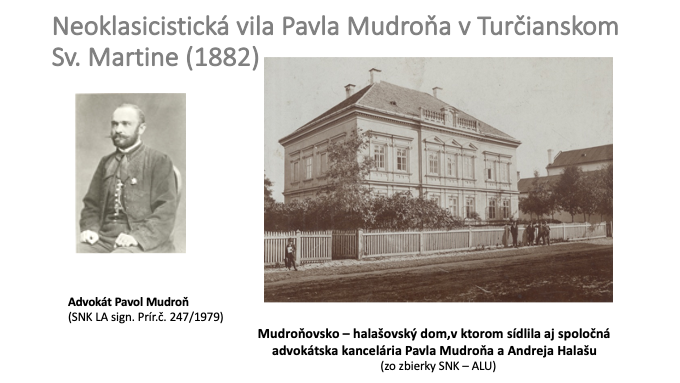 Vo vile žili nie len rodiny advokátov Pavla Mudroňa, jeho zaťa Andreja Halašu, ale aj švagor novinár Ambro Pietor. Bola sídlom spoločnej advokátskej kancelárie Pavla Mudroňa a Andreja Halašu. V nej pracovali ako koncipienti i Pavlov syn Ján Mudroň (1866-1926), ktorý tu potom pôsobil aj ako advokát, Pavlov vnuk Dušan Halaša (1883 – 1936), ale aj syn Michala Mudroňa Vladimír Mudroň (1864-1915). Vila sa stala centrom národného života a bola i sídlom redakcií Slovenských národných novín a časopisu Hlásnik (1883-1906).