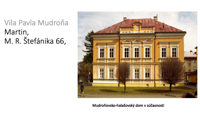 Vila advokáta Pavla Mudroňa, známa ako mudroňovsko-halašovský dom, bola postavená v roku 1882 na dnešnej Ulici M. R. Štefánika 66 v centre Martina v blízkosti prvej budovy Matice Slovenskej ako reprezentačné rodinné sídlo. Ide o dvojpodlažnú stavbu s výstavnými novoklasicistickými fasádami a trojtraktovou dspozícou. Západný trakt pozostáva zo štyroch priechodných miestností na oboch podlažiach, stredný trakt je chodbou s valenou klenbou, vo východnom trakte je medzi dvoma miestnosťami situované dvojramenné schodisko. Na uličnej fasáde v atikovom štíte sú umiestnené iniciálky PM (5).