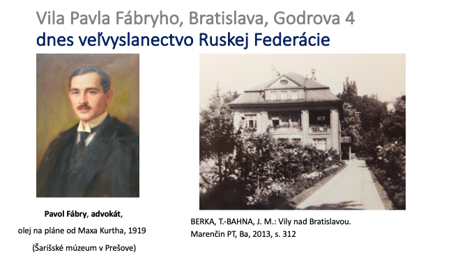 Advokát Pavol Fábry (1891-1959) sa narodil v Turčianskom Sv. Martine, právo študoval na Univerzite v Lipsku, pracoval najprv v otcovom pivovare a Kníhtlačiarskeho účastinárskeho spolku, po roku 1918 bol splnomocnencom SNR v Budapešti, vládnym komisárom pre východné Slovensko, šarišským a abovsko-turnianskym županom (1919-20) a od roku 1921 advokátom v Bratislave. Krátko mal spoločnú kanceláriu s neskorším predsedom bratislavskej komory Dr. Pavlom Šimkovicom (1890 – 1972). Býva označovaný za jedného z najbohatších Slovákov tých čias, za takého ho považuje Janko Jesenský v básni Právna istota (13), Ivan Horváth v novele Laco a Bratislava necháva hlavného hrdinu pýtať sa „policajta pri divadle na adresu pána dr. Fábryho, najbohatšieho advokáta v Bratislave“. Iný advokát – Ján Poničan pri charakteristike vtedajšej advokácie v spomienkach píše: „Najväčšiu konjuktúru mali advokáti vládnych strán – agrárnici a sociálni demokrati. Najmä agrárni advokáti zarábali ohromné peniaze – pri parcelácii veľkostatkov ako zástupcovia zvyškárov. Najznámejší taký advokátsky zbohatlík bol dr. Fábry, slávne známy gestom, že si dal na Riviéru lietadlom poslať z Bratislavy „echt“ slovenské strapačky, aby sa prezentoval ako „Slovák ako repa“. Každopádne Pavol Fábry bol vplyvnou osobnosťou pred rokom 1918 i počas 1. ČSR. Bol poradcom Milana Hodžu ale aj generálnym dozorcom evanjelickej cirkvi a.v. (14). Po smrti otca v roku 1928 zdedil martinský pivovar a účastiny viacerých spoločností. Počas Slovenského štátu bol odporcom režimu a bol krátko väznený, podporoval odboj. V roku 1949 emigroval do Švajčiarska, ušiel za dramatických okolností cez zadné okno ortopedickej kliniky na Hlbokej ceste len v pyžame naskočil do auta; jeho syn o pár rokov neskôr zahynul pri leteckom nešťastí spolu s generálnym tajomníkom OSN Dagom Hamarskjöldom ako jeho asistent (15). Pavol Fábry zomrel v Nemecku (16). Pavol Fábry s manželkou Oľgou kúpili nehnuteľnosť na dnešnej Godrovej 4 v septembri 1921 od dedičov po jej pôvodných vlastníkoch, ktorými boli od roku 1898 Dr. Jozef Neumann a Mária Lehocká. Pavol Fábry si vzal zrejme na prestavbu vily v apríli 1925 úver štyristotisíc korún od bratislavskej Slovenskej úvernej banky, úč. spol. Objekt vily bol Fábrym potom prestavaný zo staršieho objektu, vila je komponovaná v neoklasicistickom štýle (17). Projekt prestavby vily v roku 1925 objednal u Harminca Fábry. Aj poslednú prestavbu v roku 1947 si ešte pred emigráciou u Harminca objednal Pavol Fábry. Pôvodne bola vila projektovaná ako dvojpodlažný objekt s manzardou s reprezentačnými priestormi na prízemí, obytnými miestnosťami na poschodí a v podkrví s veľkoryso riešenou záhradou, tvaroslovie na fasádach vypovedá o váženom postavení stavebníka. Jadrom dispozície je schodisková hala navrhnutá cez dve podlažia s celodreveným obkladom stien, kozubom, kazetovým stropom a vysokým oknom. Na fasadach nechýbali klasicizujúce prvky – plytké pilastre s iónskymi hlavicami, motív tympanónov nad rizalitmi vstupov a empírové členenie okien (18). Klasicistické motívy na fasáde, pompézny centrálny balkón nad empírovo riešeným arkierom a tympanonom ukončená manzarda, ju radia k oficiálnemu, zdržanlivo monumentálnemu prúdu vtedajšej architektúry pre významné osobnosti (19). Vila mala však aj moderné vymoženosti, napríklad aj signalizačné zariadenie napojené na alarm pri prekročení jej oplotenia (20). Manželia Pavol a Oľga Fábryovci vo vile často usporiadavali apartné večere pre prominetných hostí s dokonalým pohostinstvom, príjemnou dobrou náladou, štýlom a úrovňou (21).