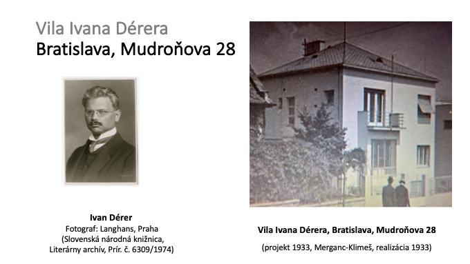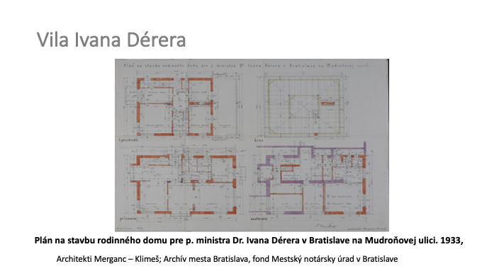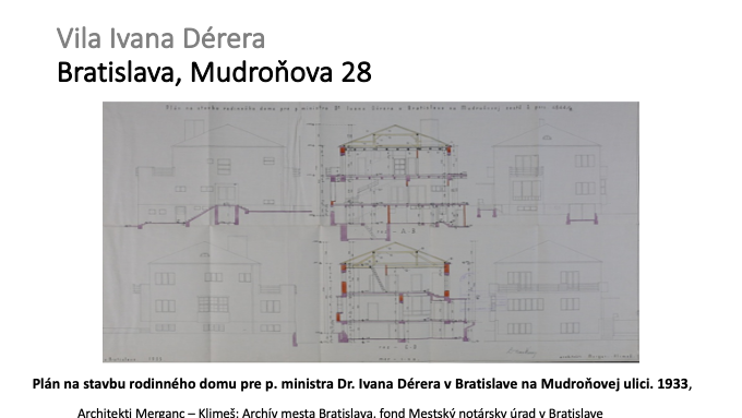 60 – Plán na stavbu rodinného domu pre p. ministra Dr. Ivana Dérera v Bratislave na Mudroňovej ulici. 1933, Architekti Merganc – Klimeš; Archív mesta Bratislava, fond Mestský notársky úrad v Bratislave.