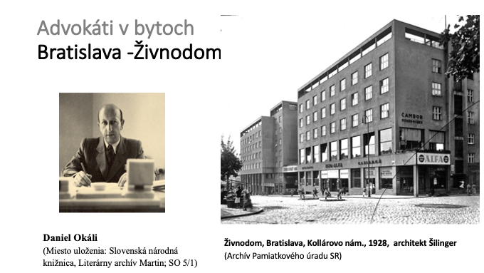 No chudobnejší advokáti stále bývali v bytoch, v ktorých mali i kancelárie. Pokiaľ im to pomery dovolili, aj oni volili novostavby – napríklad Ján Poničan žil a pracoval v susedstve bratislavského justičného paláca v prenajatom byte v bytovke na Maróthy-Šoltésovej 2, na treťom poschodí. Byt mal dve izby a halu, ktorá slúžila ako čakáreň a izba za ňou ako kancelária. Daniel Okáli býval počas svojho bratislavského pôsobenia v práve dostavanom Živnodome. Krátko po svadbe zložili kauciu, aby si mohli prenajať byt v práve rozostavanom Živnodome, ktorý sa začal stavať v roku 1929 na Kollárovom námestí podľa projektu architekta Klement Šilingera. V roku 1930 bol dokončený ako efektná funkcionalistická stavba, šesťpodlažný objekt so živnostenskými prevádzkárňami, kanceláriami, reštauráciou, kaviarňou, obchodmi, divadelnou sálou a 76 komfortnými bytmi. Okáliovci si prenajali veľký trojizbový byt so slúžkovskou izbou. Vzhľadom na vysoké nájomné prenajímali jednu izbu Clementisovi a pomohli si tak navzájom.