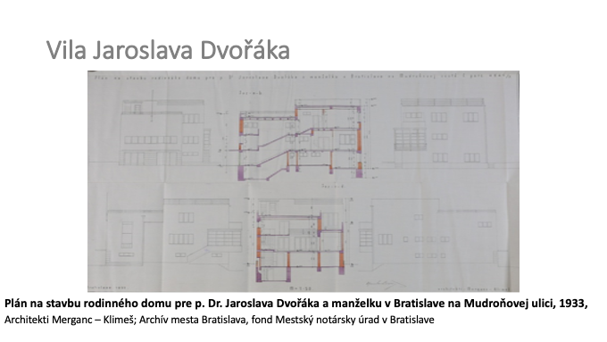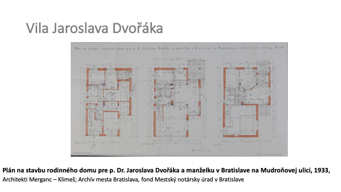 83 – Plán na stavbu rodinného domu pre p. Dr. Jaroslava Dvořáka a manželku v Bratislave na Mudroňovej ulici, 1933, Architekti Merganc – Klimeš; Archív mesta Bratislava, fond Mestský notársky úrad v Bratislave.