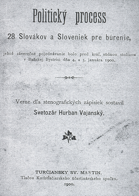 Titulná strana knihy Svetozára Hurbana Vajanského Politický process 28  Slovákov a Sloveniek pre búrenie venovaná tzv. Banskobystricemu procesu vydaná v Turčianskom Sv. Martine v roku 1900 (fond starých tlačí ŠVK Košice)