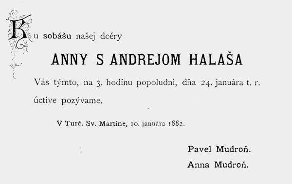 Svadobné oznámenie Anny Mudroňovej a Andreja Halašu, 1882.