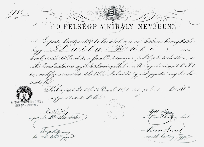 Advokátsky diplom Matúša Dulu z 3. júla 1871.