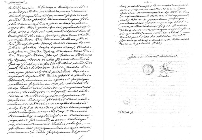 Titulná a záverečná strana rovnopisu  rozsudku Kráľovskej súdnej stolice v Banskej Bystrici, č. k. 8506/1900 z 4. januára 1900. Na poslednej strane ručne písaného rozsudku bez predtlačenej hlavičky  je pri podpise sudcu zretelný odtlačok pečivy Kráľovskej súdnej stolice Banská Bystrica.