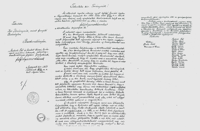 Titulná a záverečná strana odvolania 19 obžalovaných (medzi nimi Dulu, Mudroňa, Halašu aj Hurbana) proti rozsudku v Banskobystrickom procese
