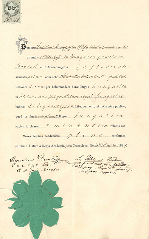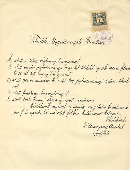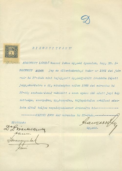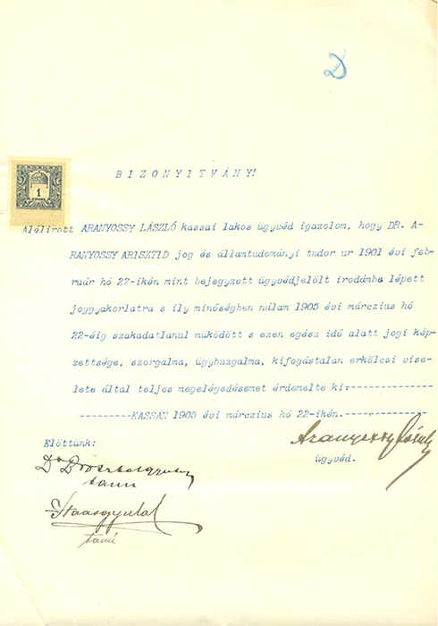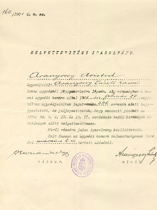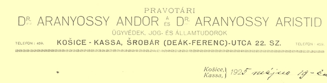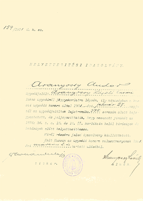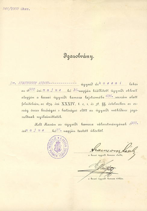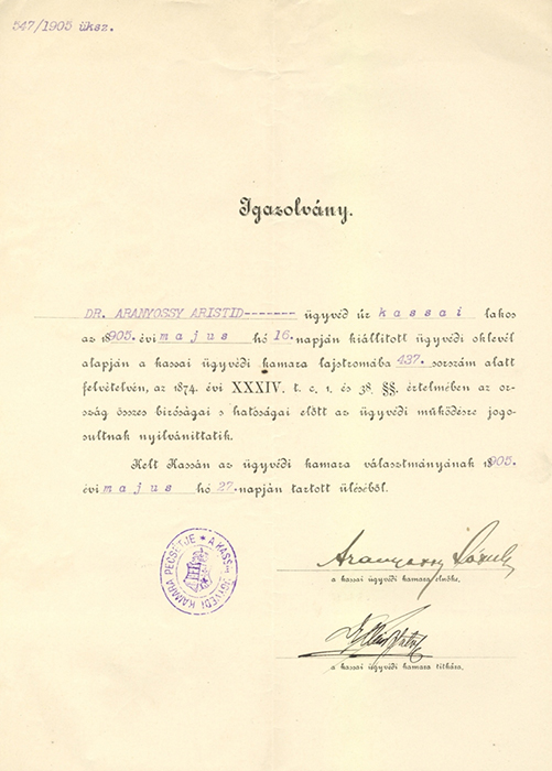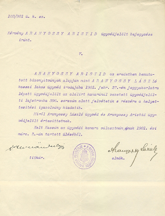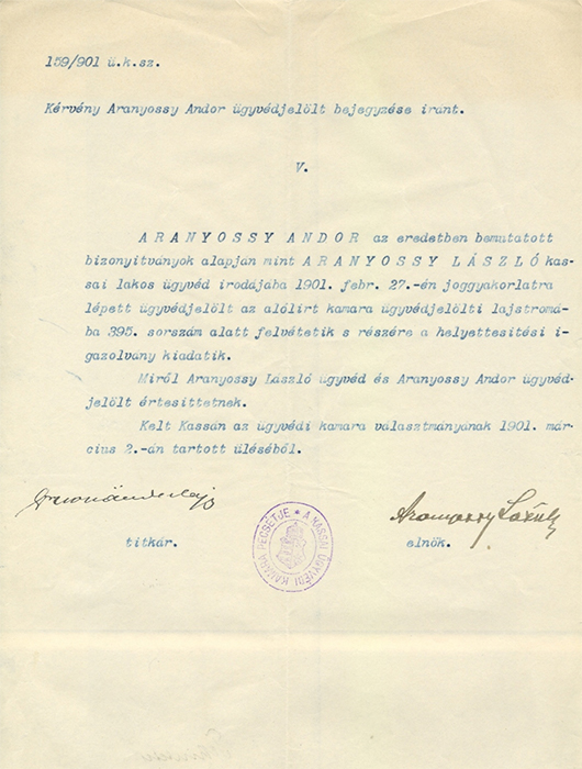 Andrej i Aristid boli do Košickej advokátskej komory ako advokáti zapísaní 27. mája 1905 (obr. č. 39, 40), potvrdenie o zápise im podpísal ako predseda komory ich otec. Andrej bol zapísaný v zozname advokátov bol pod č. 436 a Aristid pod č. 437. Obaja sídlili ako advokáti v otcovom dome.