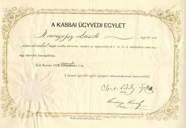 U prvého predsedu košickej advokátskej komory dr. Michala Juhásza vykonával osnovnícku prax ešte pred prijatím nového advokátskeho poriadku dr. Ladislav Aranyossy, v čase ustanovujúceho zasadnutia komory bol však už advokátom. Keď ho dr. Michal Juhász prijímal za osnovníka, určite netušil, že tento jeho osnovník sa stane neskôr sám predsedom Košickej advokátskej komory.
