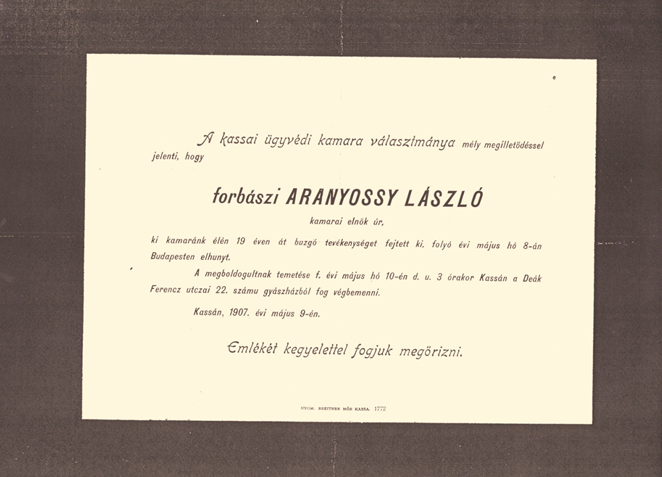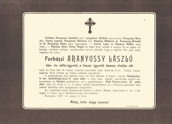 Dr. Ladislav Aranyossy bol právnym zástupcom Košickej ľudovej banky, či jasovského premonštrátskeho prepoštstva. Okrem toho, že pôsobil ako advokát bol zakladateľom Hornouhorskej stavebnej spoločnosti (1872), členom správnej rady I. košického parného mlyna, Čaňanského umelého mlyna, Košickej sporiteľne (od 1888), Parnej tehelne P. Jakab, úč. spol. (od 1912). V spoločenskom živote sa uplatnil ako funkcionár Spolku na podporu väzňov, Alžbetinho spolku starostlivosti o nevyliečiteľne chorých, podpredseda Košického telocvičného a šermiarskeho spolku (1896). Jeho vášňou bolo poľovníctvo, (obr. č. 21) bol členom a funkcionárom Košického poľovníckeho spolku (Kassai Vadásztársulat), podieľal sa na výstavbe poľovníckej chaty v sedle Repy pod Vysokým vrchom, vlastnil poľovnícky dom v Čermeli a viedol až do svojej smrti kroniku spolku. K tejto vášni priviedol aj svojich synov netušiac, že jednému z nich sa stane osudnou. Ladislav zomrel v Budapešti 8.5.1907, pohreb bol 10.5.1907 v Košiciach, na parte bolo vypísané „všeobecný i zmenkový advokát, predseda Košickej advokátskej komory“, osobitné parte vydala aj Košická advokátska komora (obr. č. 22, 23). Pochovaný bol v rodinnej hrobke (obr. č. 24). Ladislav a Štefánia, rod. Laszgallnerová mali spolu päť detí a to synov Acháca, dvojčatá Aristida a Andreja a dcéry Adrianu Repassyovú (zomr. 23.12.1946) a Alicu Cserny.