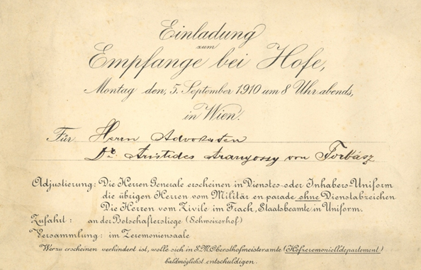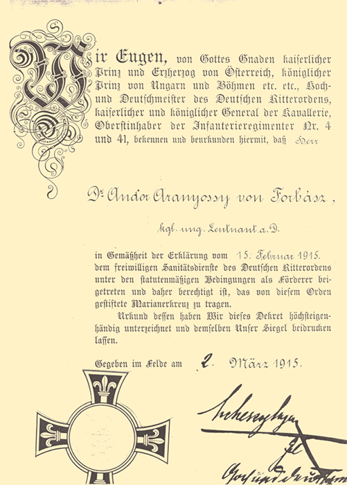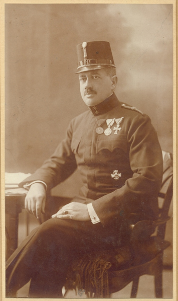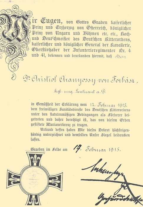 Po vypuknutí prvej svetovej vojny bratia narukovali (obr. č. 42). Aristid bol 17.2.1915 vyznamenaný v hodnosti poručíka Mariánskym krížom (obr. č. 43), Andrej dostal rovnaké vyznamenanie 2.3.1915 (obr. č. 44). Aristid bol počas 1. sv. vojny právny poradca 6. armádneho zboru (obr. č. 45, 46).