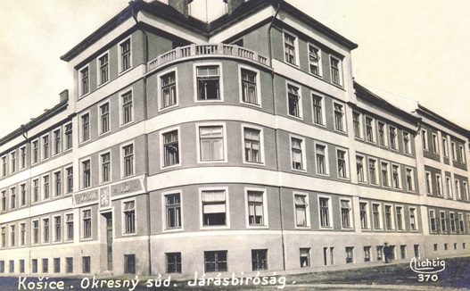 Košický justičný palác bol v časoch 1. ČSR rozšírený o budovu pre okresný súd a v časti krajského súdu nadstavaný (obr. č. 47). Budovu okresného súdu postavil na mieste prízemného domu Petra Jakaba podľa projektu Adolfa Liebschera a R. Brebtu staviteľ Alois Novák. Budova bola odovzdaná do užívania 2.2.1926 (obr. č. 48). O tieto stavebné počiny sa zaslúžil predseda súdu dr. Mičura. Súčasne bola modernizovaná i väznica.