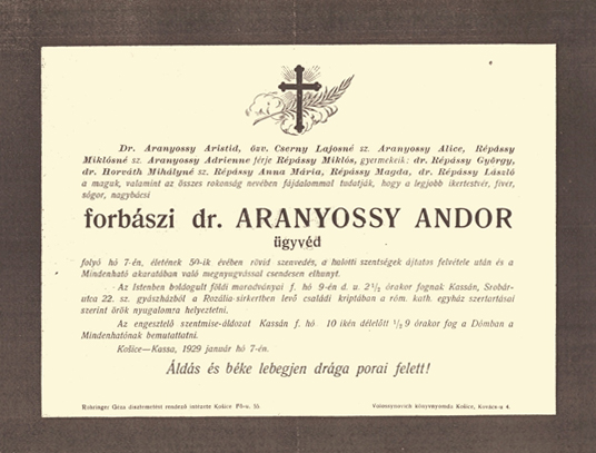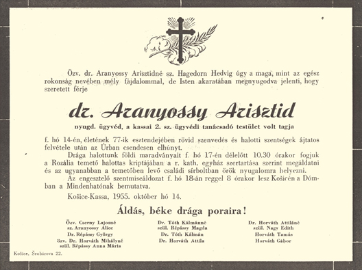 Aristid Aranyossy zomrel 14.10.1955 v Košiciach, pochovaný je na Rozálii v rodinnej hrobke. Pohreb mal 17.10.1955 o 10,30 hod., na parte (obr. č. 75) stojí napísané: „dr. Aristid Aranyossy, advokát a bývalý predseda 2. Košickej advokátskej komory“
