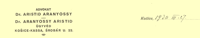 Pre úplnosť treba uviesť, že v časoch 1. ČSR bol v zozname advokátov so sídlom v Komárne zapísaný ešte jeden Andrej Aranyossy a to dr. Andrej Aranyossy pôvodom z Komárna. Od 2.1.1925 vykonával koncipientskú prax u dr. Jozefa Hraneca v Čadci až do 15.2.1926. Od 16.2.1926 nastúpil ako osnovník k advokátovi dr. Ladislavovi Aranyossymu (!) so sídlom v Komárne (takýto advokát bol skutočne v zozname advokátov so sídlom v Komárne zapísaný), u ktorého pôvodne od 6.8.1921 osnovnícku prax začal pred odchodom do Čadce. Tento Andrej Aranyossy zložil jednotnú sudcovskú a advokátsku skúšku v Košiciach 28.10.1925 a následne bol do zoznamu advokátov so sídlom v Komárne aj zapísaný (je vedený v zozname ku koncu roku 1928). Či existoval nejaký príbuzenský vzťah s košickými Aranyossyovcami nevedno.