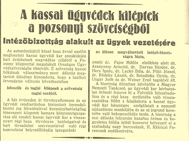 Niektorí košickí advokáti už v novembri 1938 kolektívne vystúpili z martinskej advokátskej komory a začali prípravy pre vytvorenie samostatnej košickej komory. O udalosti informovali noviny Kassai Ujság (10.11.1938) (obr. č. 53) a uviedli, že advokáti si vytvorili i osobitný výkonný výbor za predsedníctva dr. Mikuláša Pajora a členstva dr. Aristida Aranyossyho (obr. č. 54), dr. Sándora Darvasa, dr. Ignáca Hercza, dr. Vojtecha Laczka, dr. Jozefa Piláta, dr. Ladislava Rédekyho, dr. Jozefa Sztudinku, dr. Jóba Ungára a dr. Ernö Weisera. Advokát dr. Mikuláš Pajor mal dvoch synov: jeden z nich bol vojenský sudca, v súvislosti s ktorým pretrváva spomienka na to, že keď raz vyhlásil rozsudok smrti nad obžalovaným, od vnútorného napätia v pojednávacej miestnosti odpadol a druhý po tom, čo po vojne emigroval do Brazílie, usadil sa nakoniec v New Yorku, kde pracoval ako módny návrhár (a preslávil sa v 50. rokoch modelom založeným na nápade bielymi akoby kriedovými čiarami na čiernom tričku vykresliť smoking).
