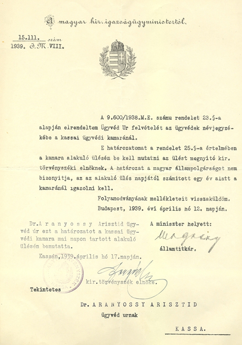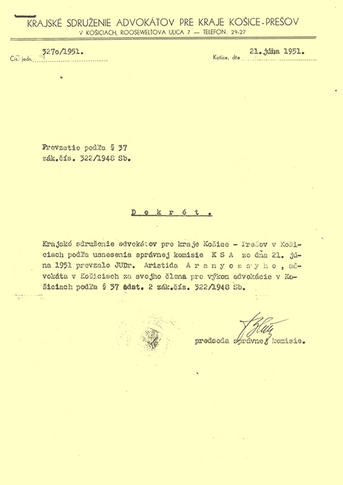 Krajské združenie advokátov pre kraje Košice – Prešov pod č. 3270/1951 nakoniec rozhodlo 21.6.1951 o prevzatí dr. Aristida Aranyossyho za svojho člena s miestom výkonu advokácie v Košiciach. Aristid Aranyossy v rovnaký deň do rúk predsedu správnej komisie zložil v poradí svoj piaty advokátsky sľub. Je zaradený do Advokátskej poradne č. 2 v Košiciach s väčšinou starších kolegov, ktorých KZA prevzalo napriek stanovisku vedúceho krajského súdu. Jednotliví advokáti, ktorí boli prevzatí do KZA prenechali svoje kancelárie a zariadenie KZA (obr. č. 71).