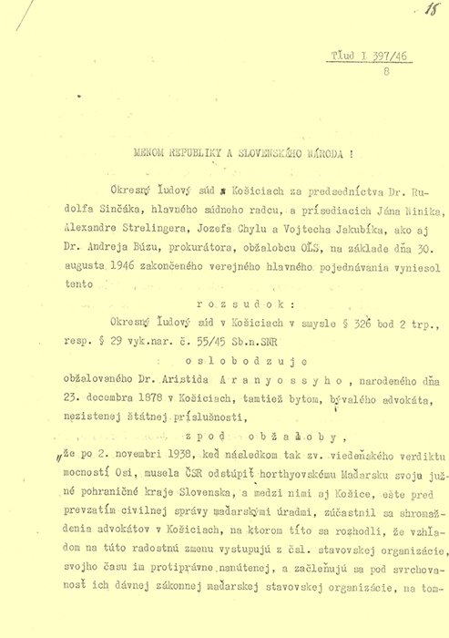 Aristid Arannyossy bol týmto rozsudkom spod obžaloby oslobodený (obr. č. 65). Okresný ľudový súd po tom, čo zhrnul vyjadrenia obžalovaného a poukázal na obsah vyhlásení predložených obžalovaným, uviedol: „Proti popieraniu obžalovaného jedine na základe novinárskeho článku Kassai Ujságu z 10.11.1938, na ktorý sa obžaloba ako dôkaz odvoláva, súd nemal za preukázané dostatočne, že by bol sa obžalovaný činu jemu za vinu kladenému dopustil, preto bolo treba rozhodnúť podľa enunciátu zhora. Z obsahu článku totiž nevysvitá, že by bol sa obžalovaný skutočne tejto schôdzky zúčastnil, alebo aspoň predom prejavil súhlas so svojím zvolením do správnej komisie, zvolenej na tomto zhromaždení a že by sa bol tiež osobne zúčastnil pri kladení venca na pomník Rákocziho. Obžalovaný síce priznal, že bol členom preverovacej komisie, ale z pripojených svedectiev vysvitá, že v tejto komisii týmto zamestnancom Slovákom práve pomáhal a neškodil a jedine tá okolnosť, že členom preverovacej komisie bol, podľa názoru súdu nie je takou činnosťou, ktorá by spadala pod trestné ustanovenia nariadenia č. 33/45 Sb. n. SNR“.