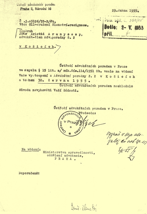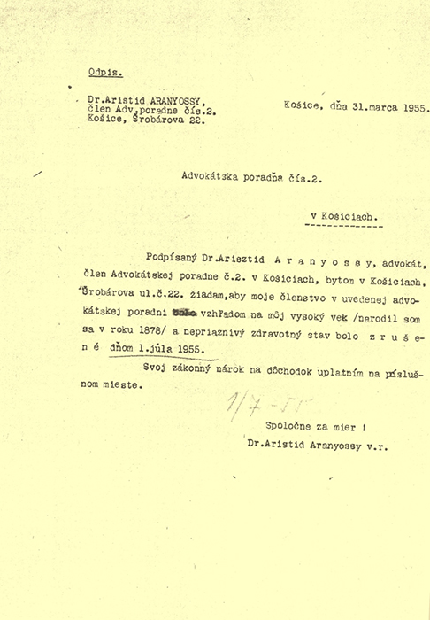 Čas je neúprosný – je už len otázkou času, kedy sa Aristid Aranyossy advokácie vzdá. Urobí tak nakoniec listom z 31.3.1955 (obr. č. 73), v ktorom požiada o zrušenie svojho členstva v Advokátskej poradni č. 2 v Košiciach k 1. júlu 1955 a to vzhľadom „na vysoký vek a nepriaznivý zdravotný stav.“ Ústredie advokátskych komôr jeho žiadosti vyhovie (obr. č. 74) a dňom 30. júna 1955 prestáva dr. Aristid Aranyossy definitívne advokáciu vykonávať.